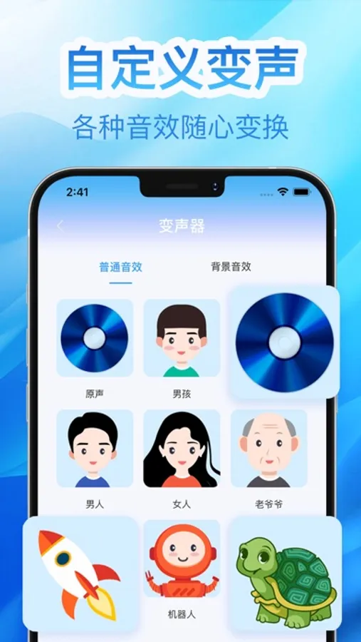 支持多种变声特效,男声女声、小孩老人等,有趣音效随心变;