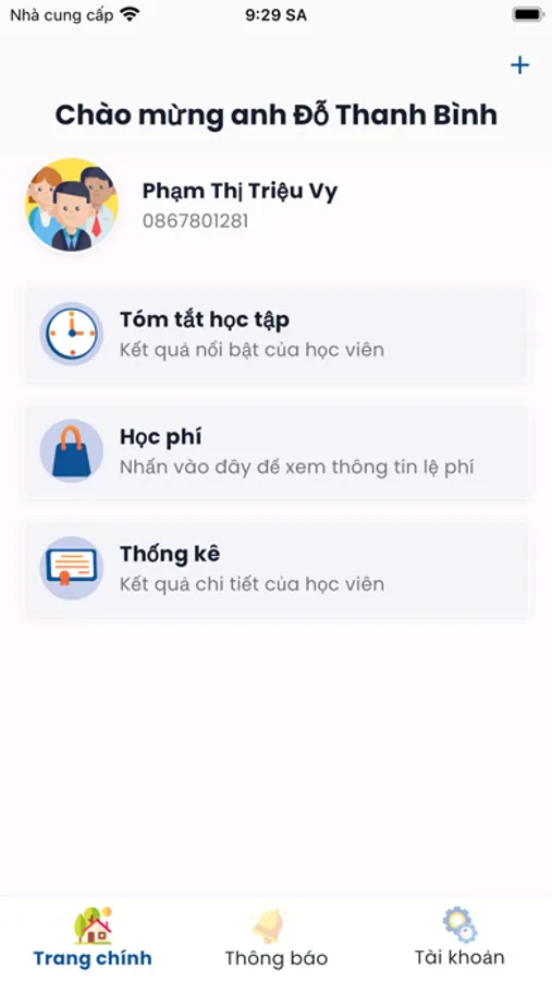 - Phụ huynh nhận ngay các thông báo về tình hình học tập của con: về điểm, chuyên cần, kết quả tự học và các sự kiện đặc biệt được trung tâm tổ chức trong khóa học của con