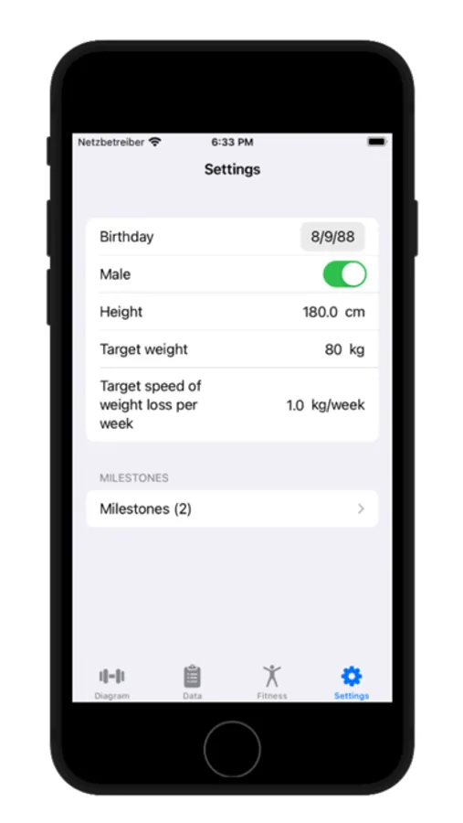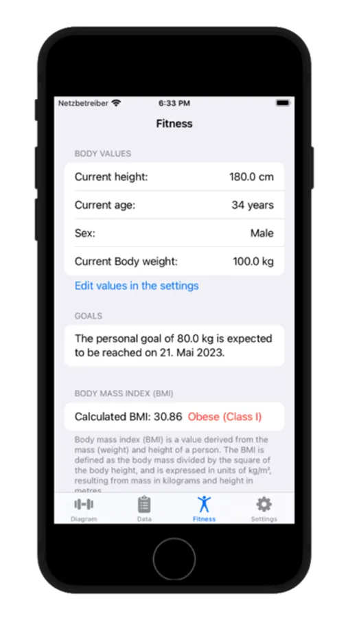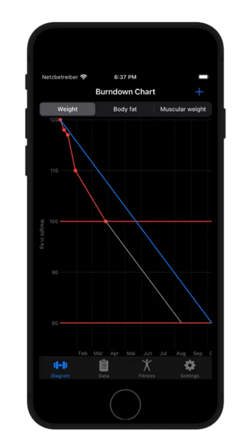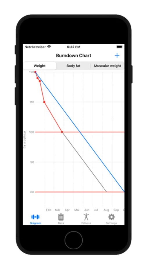 With the help of iBurndown you can systematically lose weight and record your body weight, muscle mass and body fat percentage.