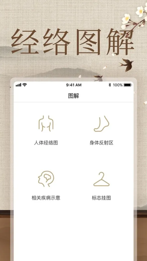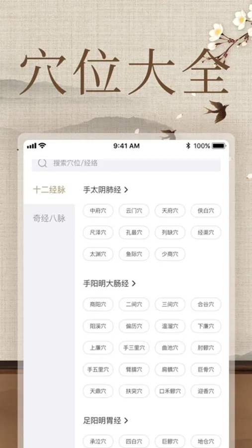 经络穴位图解,配合强大的穴位搜索功能,让你快速掌握。