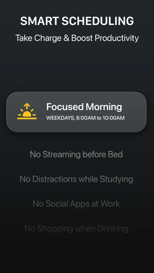 - Schedule when you want to block apps - start your day with ambition, not doom scrolling.