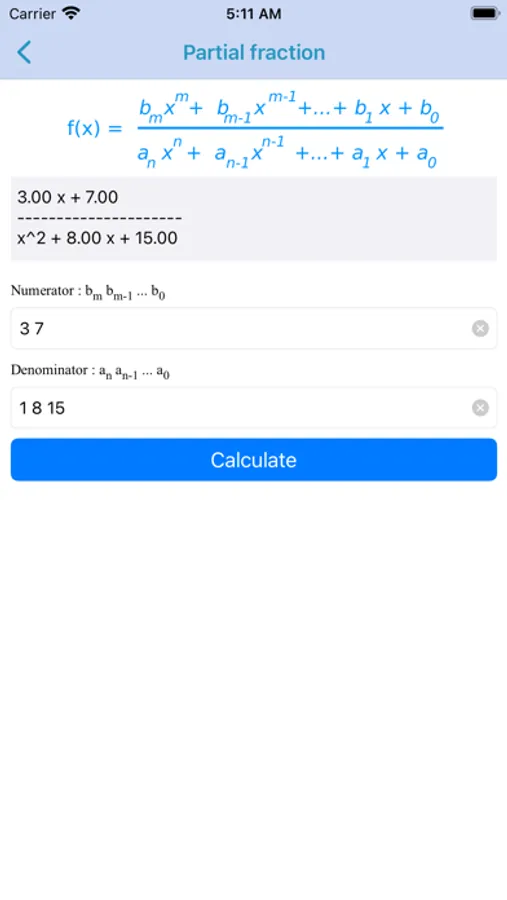 This app is a tool for calculating partial fraction decomposition. It is suitable for hobbyist, engineers or professionals.