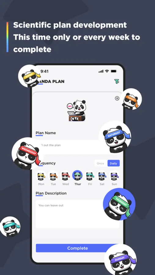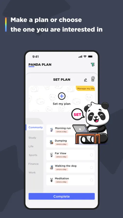 Panda Plan: Create various things that need to be done every week. The ones that need to be done every day. One-time matters. Categorize each event and record the mood of each completion. The accumulation of a few becomes many, develop good habits, a sense of accomplishment is also born.