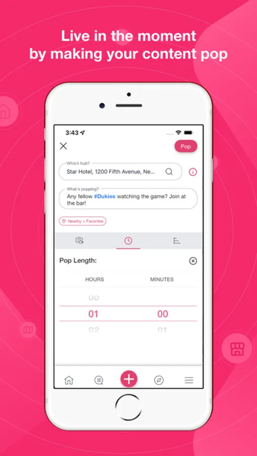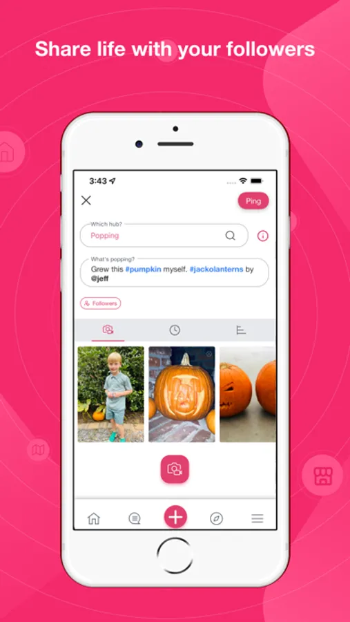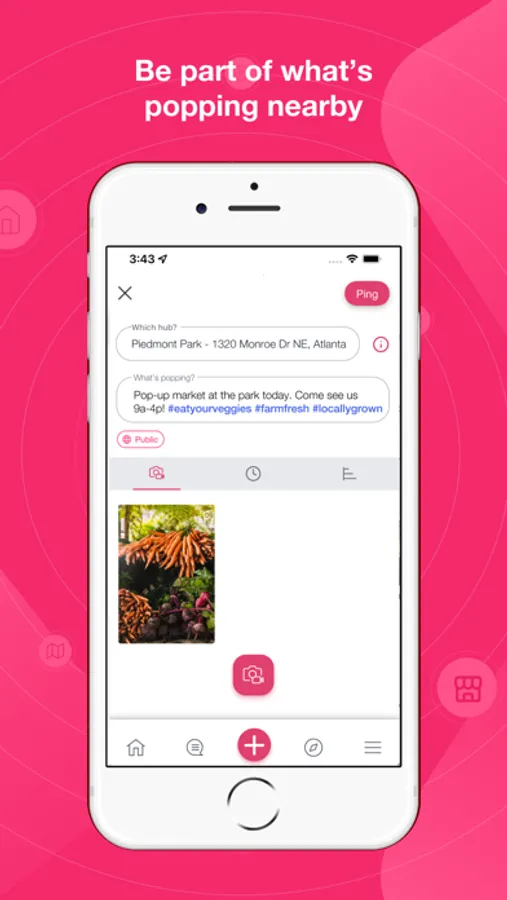 Start Popping. In Popping, each post (aka a ping), is associated with a physical place you could find on a map (we call these hubs). Quickly choose the hub you want to share to each time you create a ping. Post to the “Popping” hub when you want to share with the general Popping community rather than a specific place. Add photos, videos, polls and tag other users.