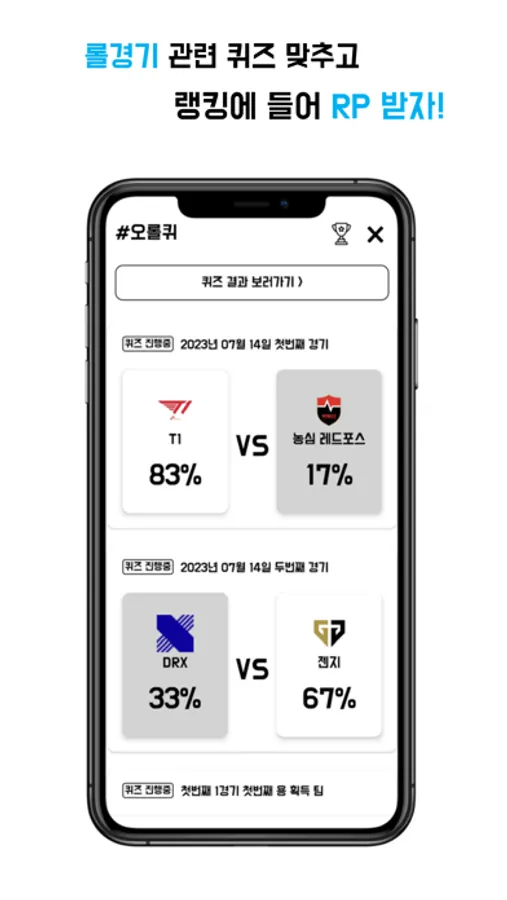 - 승부예측, 승자팀 점수 예측, 일반 퀴즈 문제를 풀어 일주일 동안 진행 되는