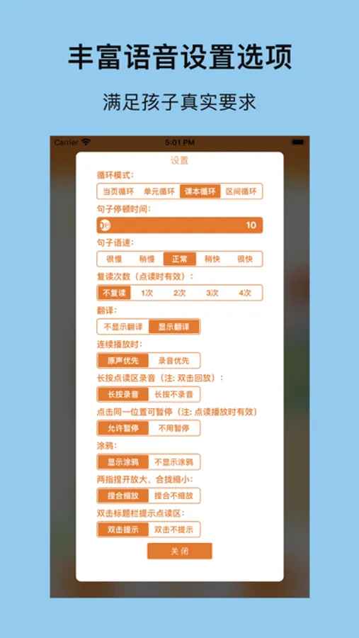 1、跟读模式:循环当页、循环单元、循环课本、区间循环