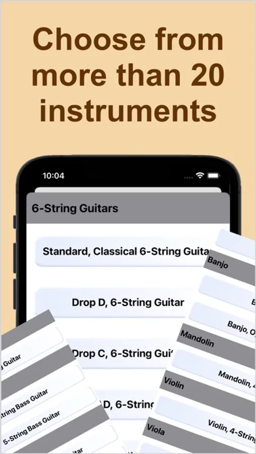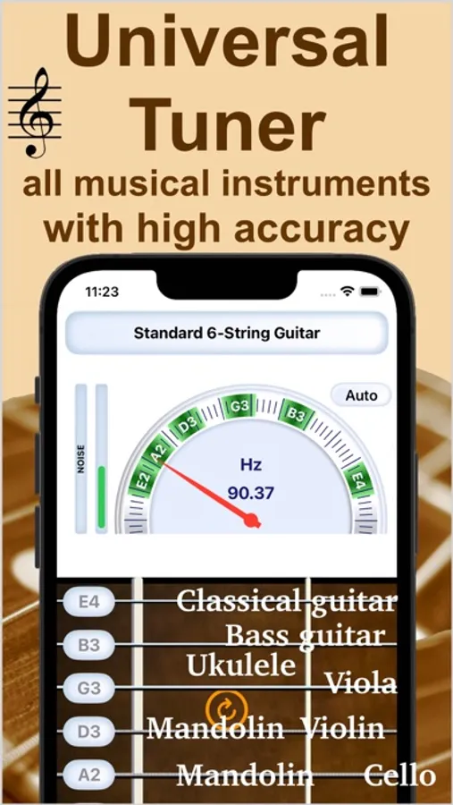 There are more than 20 musical instruments which can be easily tuned in the app: 6-strings, 7-strings, 12-strings and bass guitars, mandolin, ukulele, banjo, violin, viola, cello, shamisen, domra, oud, balalaika. If you think that we have missed any musical instrument please let us know! Our development team will be happy to add your instrument.