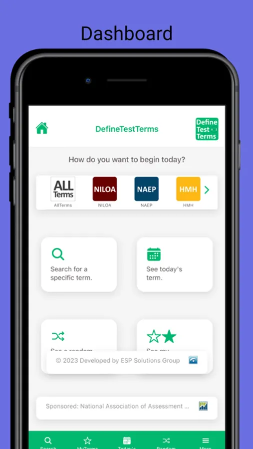 The National Association of Assessment Directors (NAAD) and ESP Solutions Group have worked together to create an app at your fingertips where you can access a comprehensive glossary/dictionary of assessment terms for quick definitions. The app includes both general and technical terms and is beneficial while reading a school report, attending a lecture, viewing a video, participating in a Zoom meeting, writing a document, nuancing a meaning, composing an assessment, or engaging in any one of many other tasks.