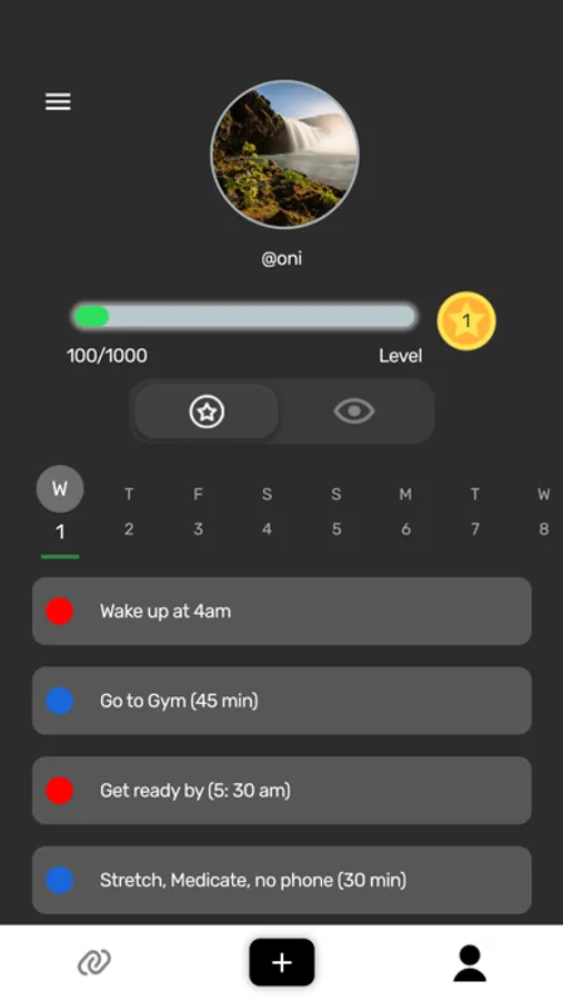 Every day throughout the day, everyone will review their goals and swipe left (failed) or swipe right (succeeded) their goals to either earn points & level up or lose points & level down.