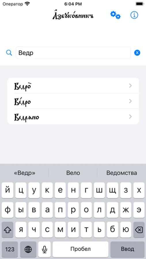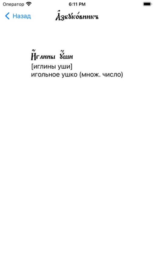 Достаточно простой поиск перевода слов с церковнославянского на русский язык. Для использования нужно уметь читать на церковнославянском, чтобы написать произношение слова русскими буквами в строке поиска.