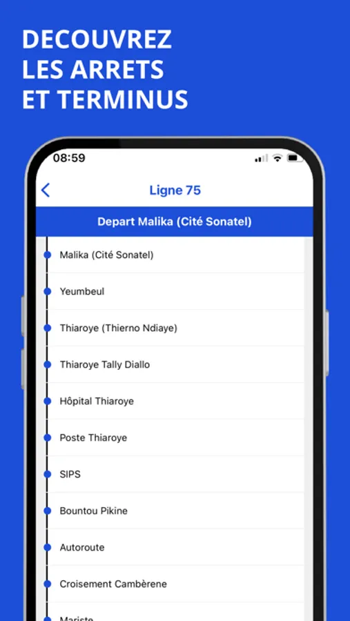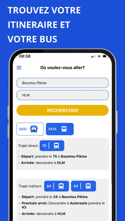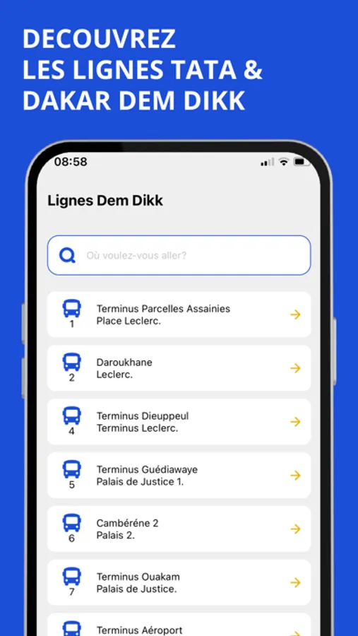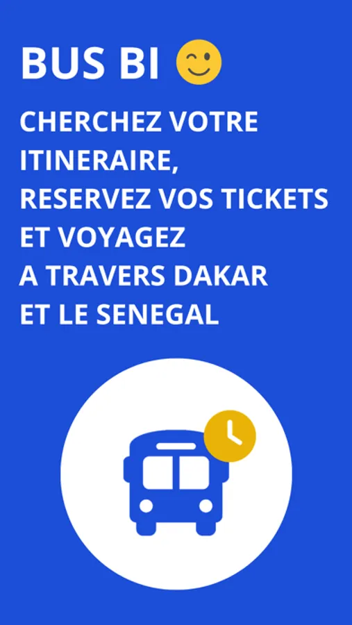 Bus Bi est une application qui te permet de rechercher les différents itinéraires des bus TATA et Dakar Dem Dikk et de réserver ton ticket pour tes voyages avec Senegal Dem Dikk . Nous te facilitons l’usage de l’application, afin que tu puisses arriver à destination le plus vite possible.