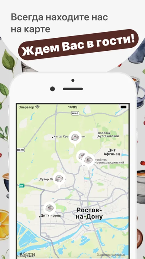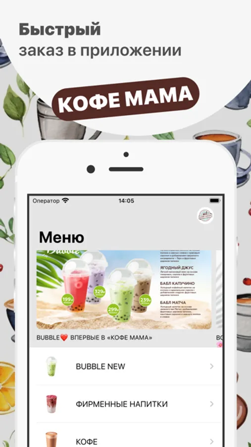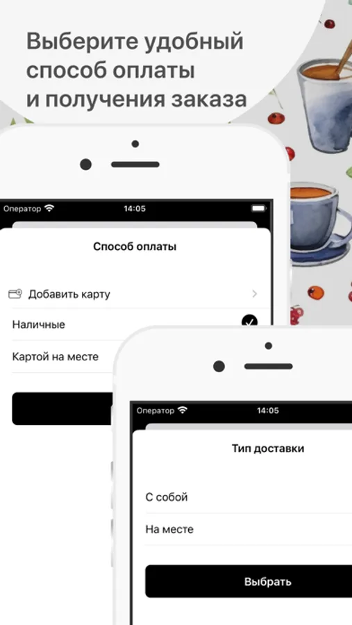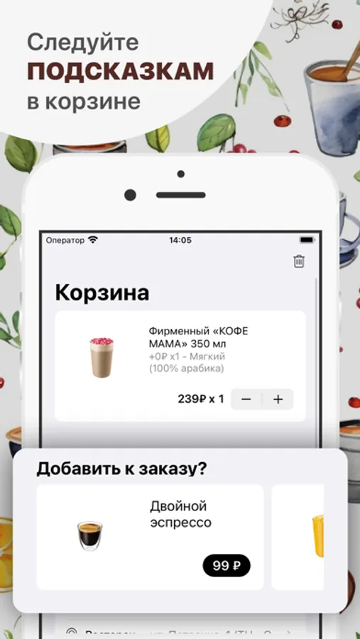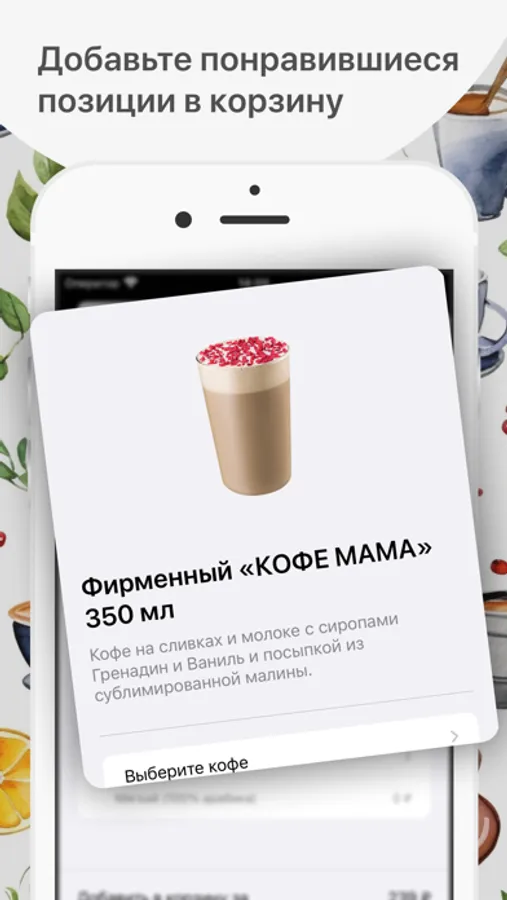 Как сделать заказ в приложении “КОФЕ МАМА”: выберите понравившиеся позиции из меню, добавьте их в корзину и перейдите на экран оформления заказа (по нажатию на иконку корзины).