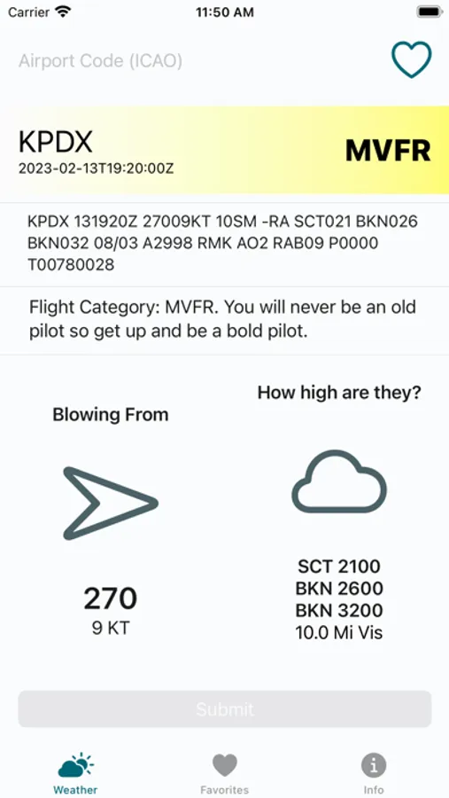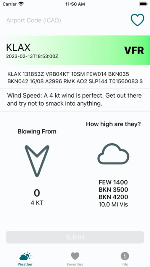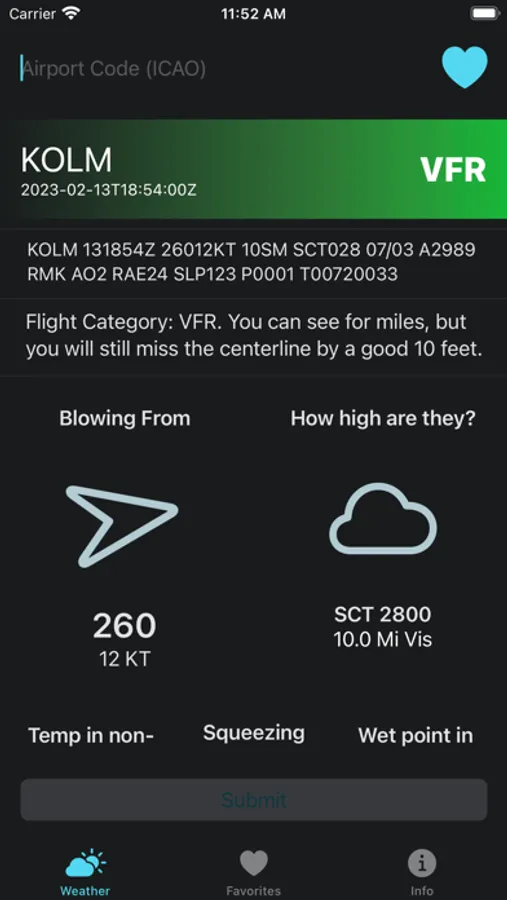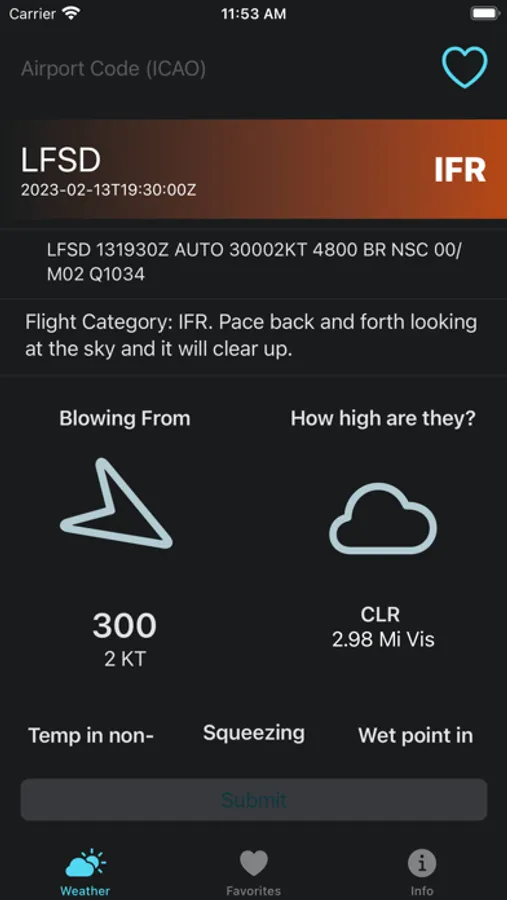 This app will (not) make you better at understanding the weather at your local airport. Using the power of pixies, wizards, and internet connected weather stations, we are able to bring you weather from just about every ICAO registered airport. Much like 90% of the internet, THE DATA IS REAL, but the advice is not.