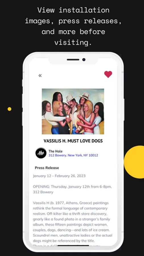 * Find nearby galleries, view installation images, press releases, and more before visiting.
