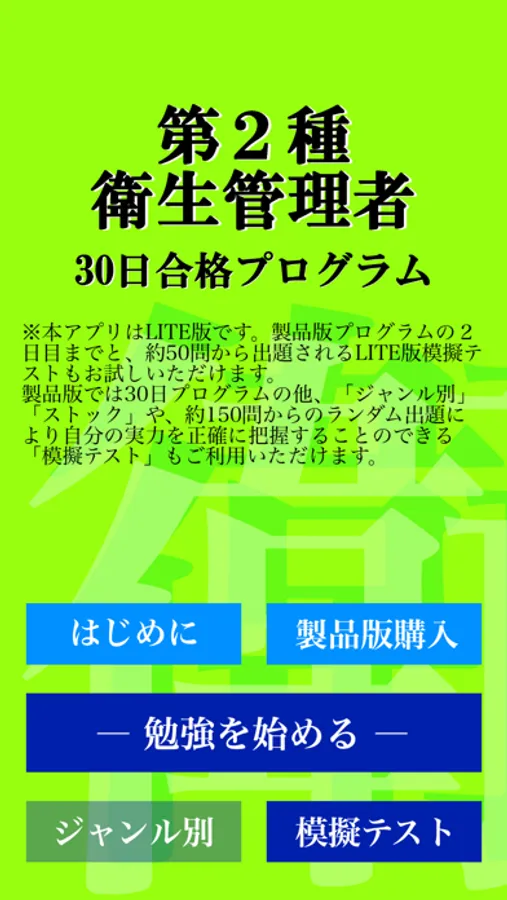 本アプリは第2種衛生管理者試験に合格するためのものですのでお間違えの無いようお願いいたします。