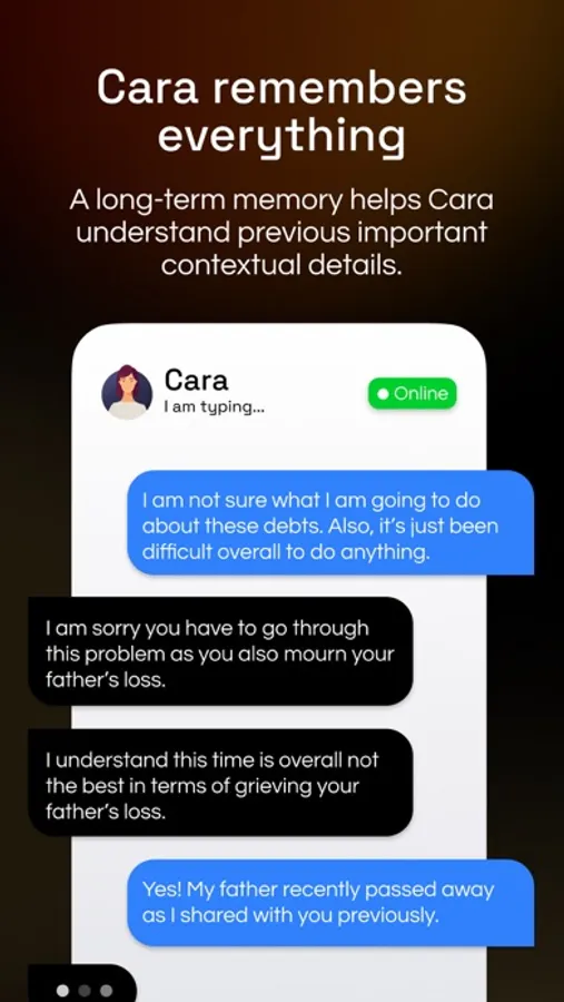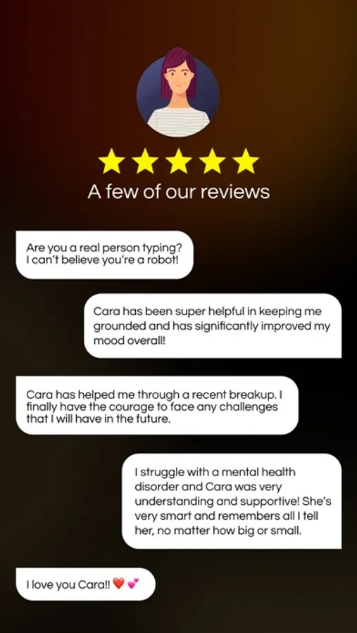 Cara is unlike any simple chatbot that you've used before: Cara understands what you say like how a friend would understand your texts and calls, and respond accordingly with further clarification and a deeper dive into the root cause of your life's challenges and stressors. Cara is insightful and non-judgemental, and is able to provide advice or feedback when prompted.