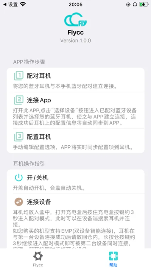 Flycc系列蓝牙耳机配套APP,通过丰富的人机界面,向您展示更多产品中的隐含功能,进一步提升产品的价值和可玩性。针对部分产品更提供了固件升级选项,让您的产品随时能摇身一变,升级换代。