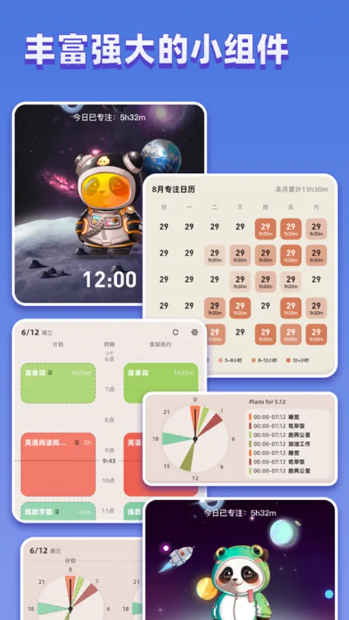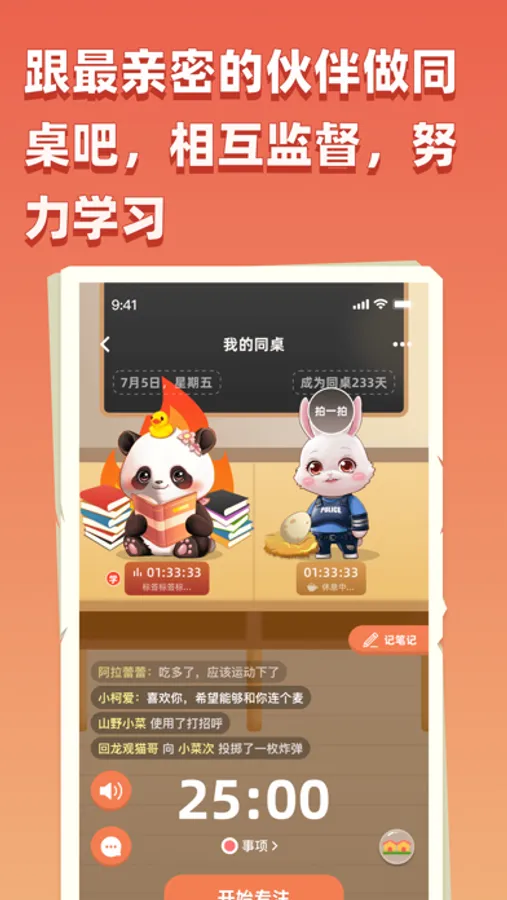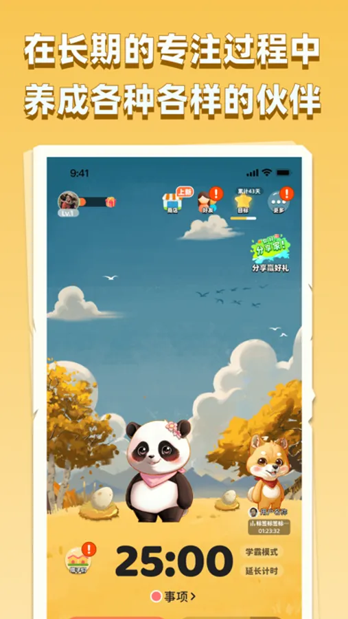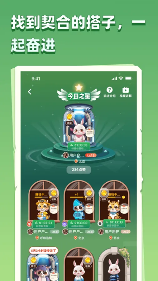 通过专注学习获得奖励后,你可以用于投喂你的伙伴,伙伴具有独特的技能,升级伙伴能够提升等级,并且到达一定等级后可以为他搭配不同的穿搭。你甚至可以把伙伴放到小组件,让TA更好的陪伴你