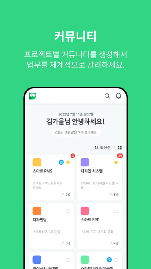 프로젝트별로 커뮤니티를 생성해서 업무를 체계적으로 관리할 수 있습니다.