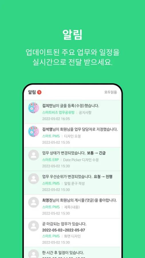 업데이트된 주요 업무와 일정을 실시간으로 전달받을 수 있는 알림 기능으로 업무에 흐름을 이어갈 수 있습니다.