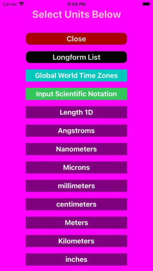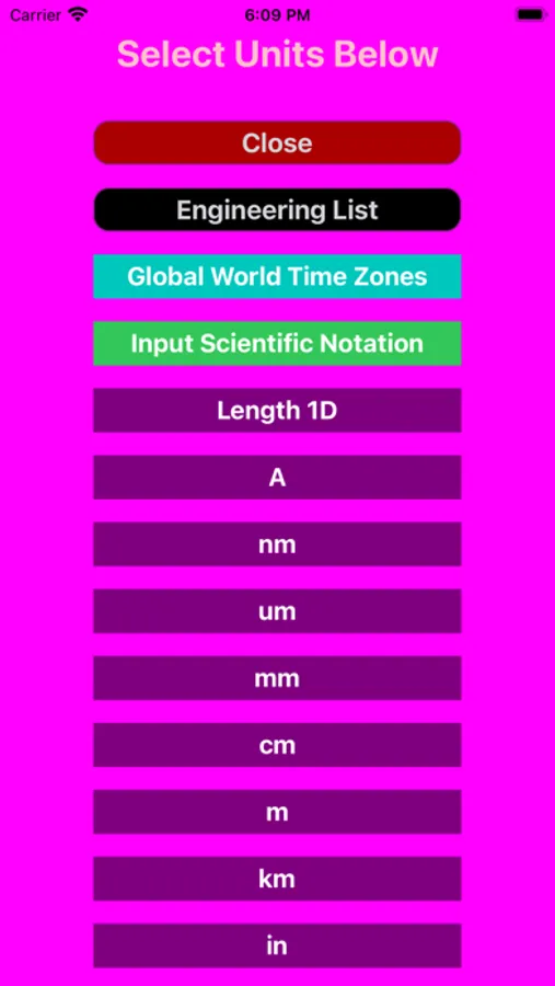 Toggle the "Longform List" / "Engineering List" button to Switch Between 1) a List of Unit Buttons in Shortform Engineering style, or 2) in Longform style for a more Wordy Description. note: this ALSO toggles between Scientific Notation & Standard Decimal Form.