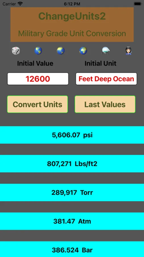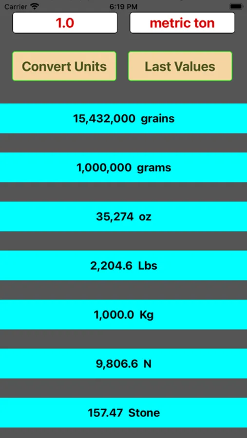 The "Last Values" button Remembers your Last 33 Calculations using "Convert Units"