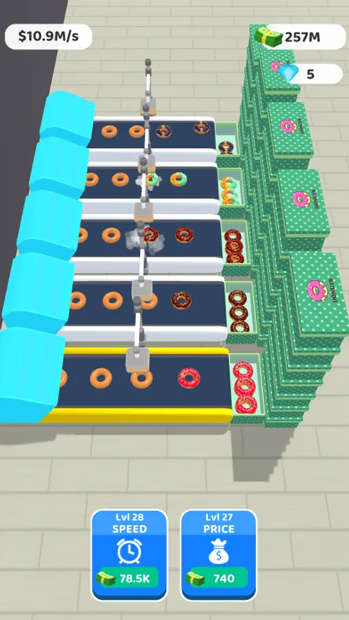 Do you love to make donuts and produce it in your factory, then this game is for you. Create variety of donuts earn money and upgrade your factory.