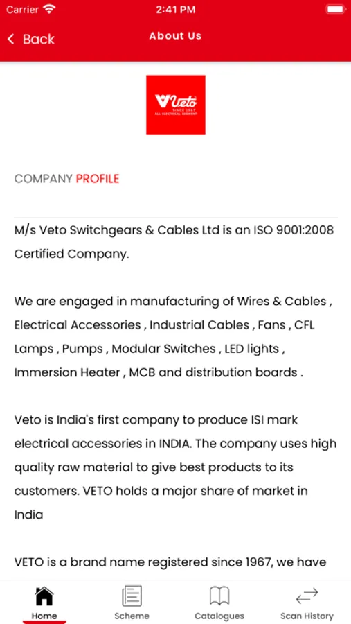 Our Company (An ISO 9001:2008 certified and BBB+Rated by ICRA) is engaged in manufacturing of wires & cables, Electrical Accessories & all type of range of led lighting, CFL & Fans. We use latest production technology and also produce latest products as per market demand in our manufacturing unit located at Haridwar & Vasai (Mumbai). The Brand name "Veto" is since 1967.