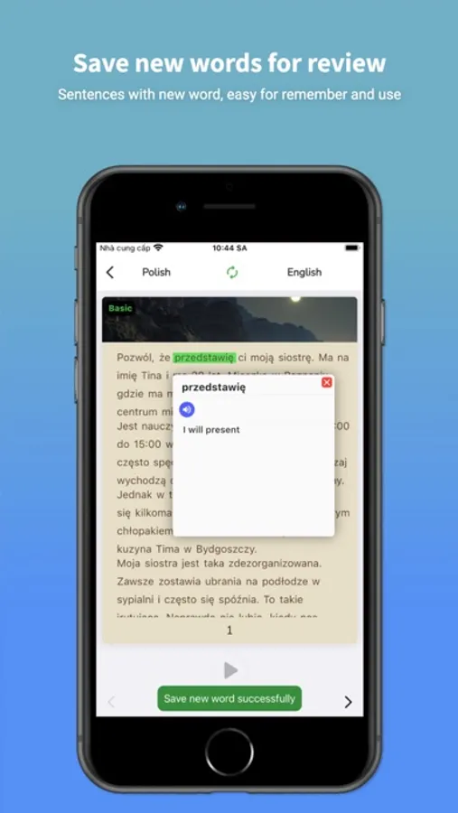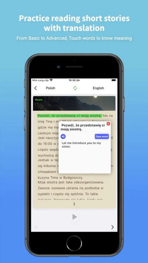 Improve Polish Vocabulary by reading short stories from basic to advanced with english translation, reviewing new word flash cards.