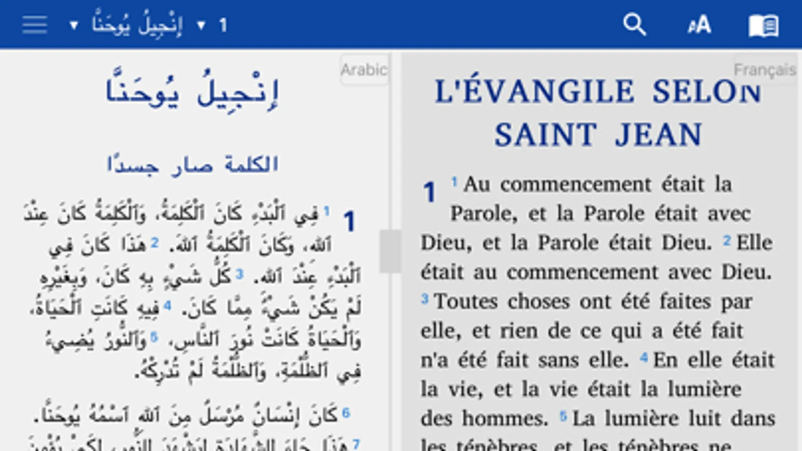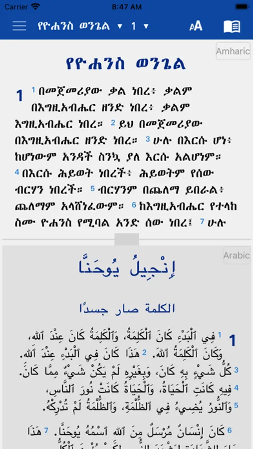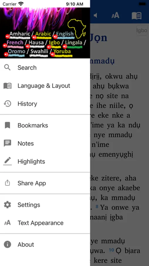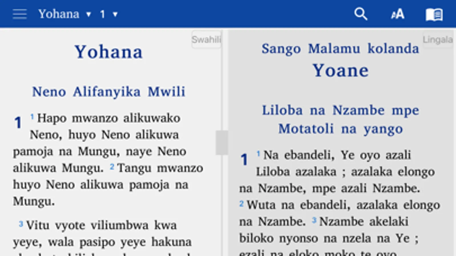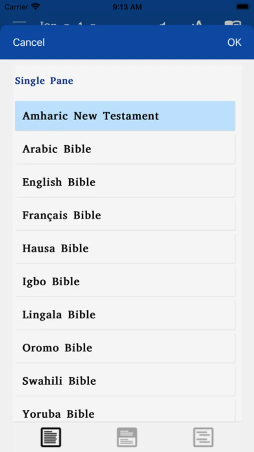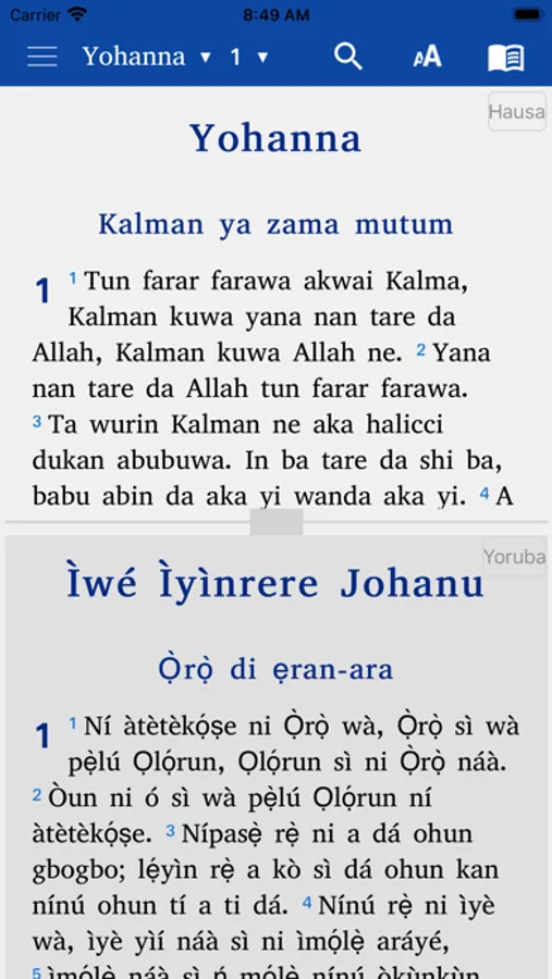 • Split screen: If you want two languages in parallel on your screen, you click on the book icon and then you tap on the split screen icon below in the middle of the navigation window, then you choose the two languages you want to display on your screen. For example: Hausa at the top and French at the bottom etc.