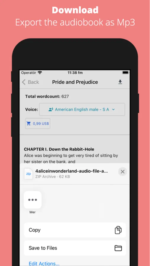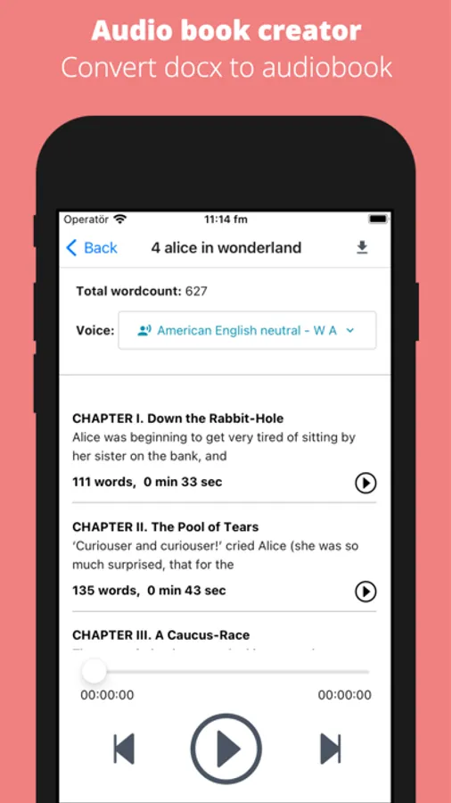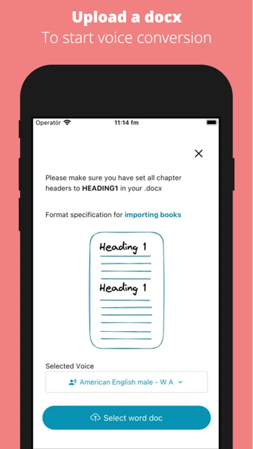 Convert your docx manuscript to an audiobook and download the converted Mp3 or M4b files. AudioBooker let's you select among a wide range of available voices.