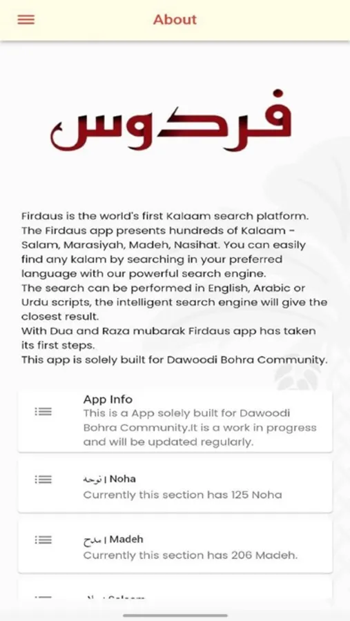Firdaus is our first Kalaam search platform. The Firdaus app presents hundreds of Kalam - Salam, Marasiyah, Madeh, Nasihat and many more. You can easily find any kalam by searching in your preferred language.
