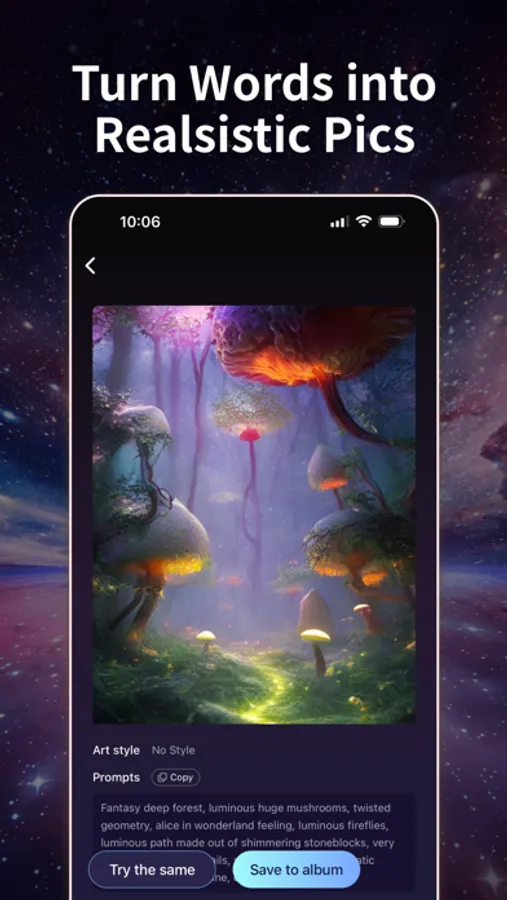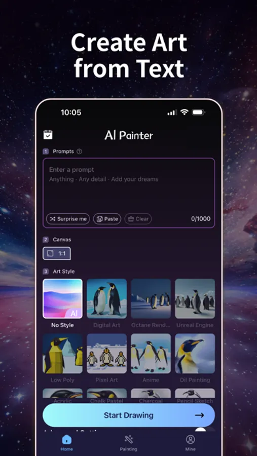 AI Draw provides you with the coolest art creation experience. Whether it's a blazing sunset, a magic academy, a cartoon avatar, or an underwater world, simply describe your idea or even just a few words. Choose a style, and AI Draw will present you with unexpected digital artworks.