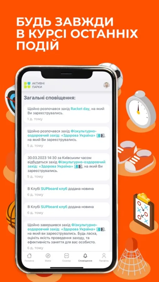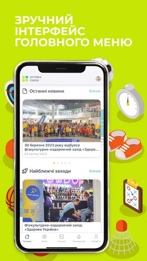 Соціальний проект Президента України і Міністерства молоді та спорту України «АКТИВНІ ПАРКИ - ЛОКАЦІЇ ЗДОРОВОЇ УКРАЇНИ» - розробка навігаційної карти безкоштовних для населення рекреаційних занять в парках та скверах. Основною метою є залучення людей до систематичних тренувальних сесій, спрямованих на розвиток основних рухових якостей - загальна витривалість, сила, спритність, координація, гнучкість, швидкість.
