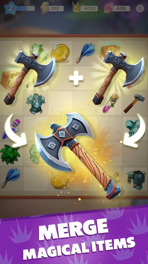Merge farming tools, food, magical potions, and spells to solve the merging games offline.