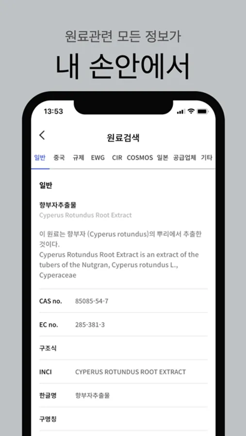 일반정보, INCI, 중국 기사용화장품 원료명, 규제사항, EWG, COSMOS, 공급업체 등 원료와 관련된 다양한 정보를 모두 내 손안에서 검색 가능