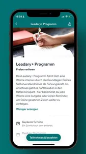 Dafür erarbeitest du dir in einer ersten intensiven Woche dein persönliches Leitbild für deinen Führungsstil. In den anschließenden 3 Monaten erinnert dich Leadary+ regelmäßig an die Umsetzung deiner Ziele, hilft dir beim reflektieren, nachjustieren oder setzt neue Impulse.
