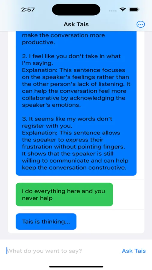 Do you ever struggle to find the right words when you're trying to communicate with your partner? Ask Tais is here to help. Our AI chatbot, Tais, is designed to help you communicate more effectively with the people you care about. Simply type in something you want to say, and Tais will provide you with revised sentences and explanations to help you say it better. Whether you're dealing with a difficult conversation or just looking to improve your communication skills, Ask Tais has you covered. Download the app now and start building stronger relationships through better communication.