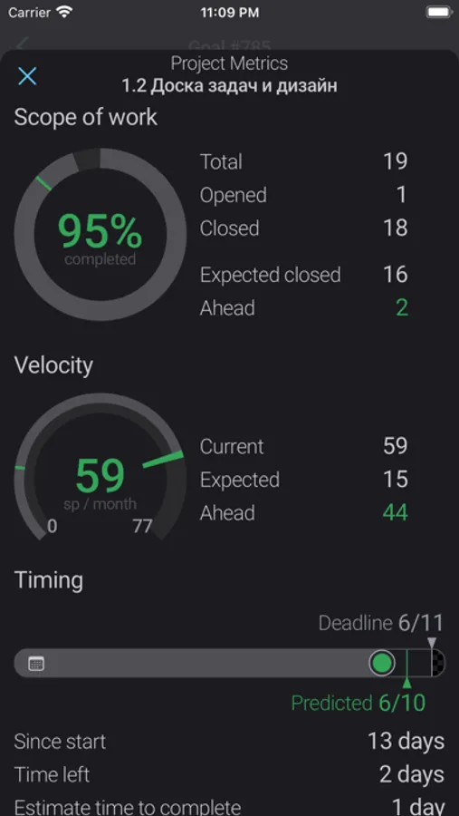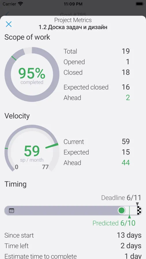 - Displaying information about the speed of execution and the amount of work done for projects in the form of a dashboard.