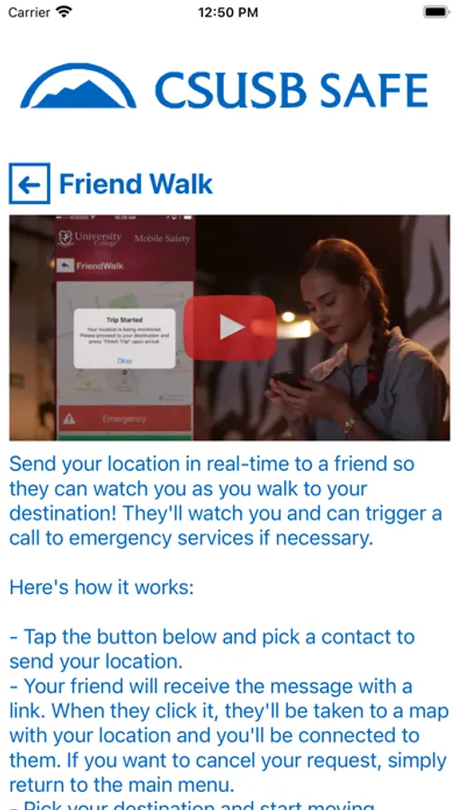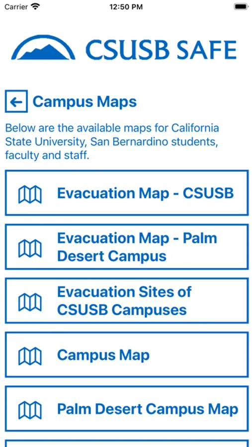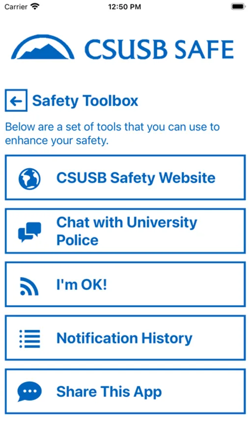 CSUSB Safe is the official safety app of CSUSB. It is the only app that integrates with CSUSB's safety and security systems. University Police has worked to develop a unique app that provides students, faculty and staff with added safety on the CSUSB campus. The app will send you important safety alerts and provide instant access to campus safety resources.