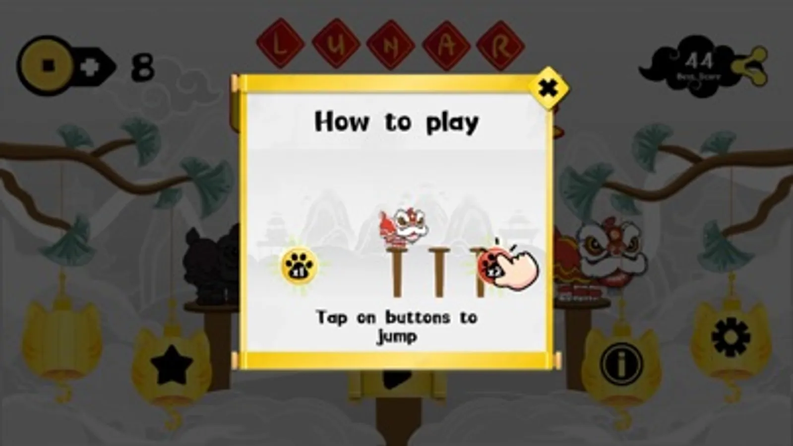 Easy and Quick Gameplay: Lunar Lion Dance has straightforward gameplay. All you have to do is tap the available jump force to jump on the incoming platforms. Tap on the available jumps in the game. Jump once or jump twice. Plan your route ahead. Gameplay and game art have been upgraded from the last version. Pick up coins too to be used in the Lion Dance shop.