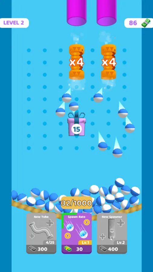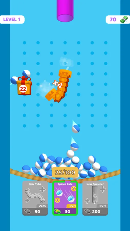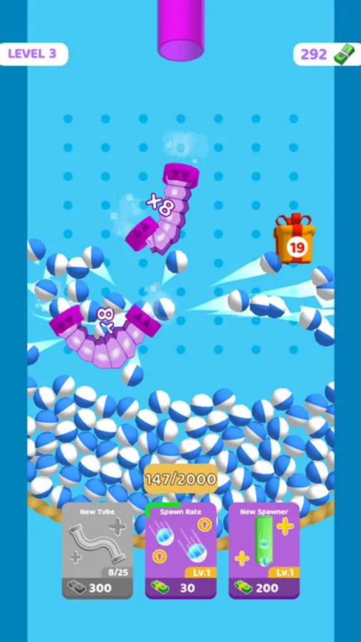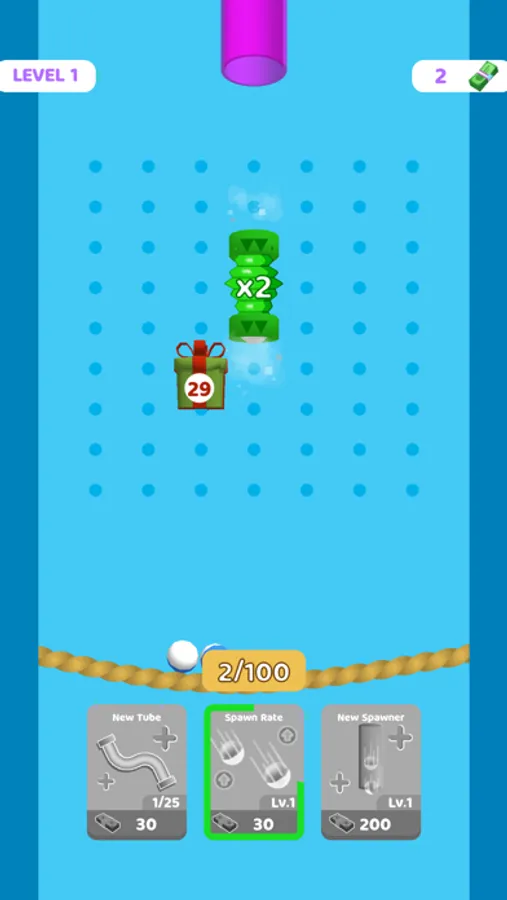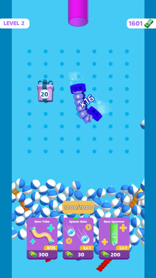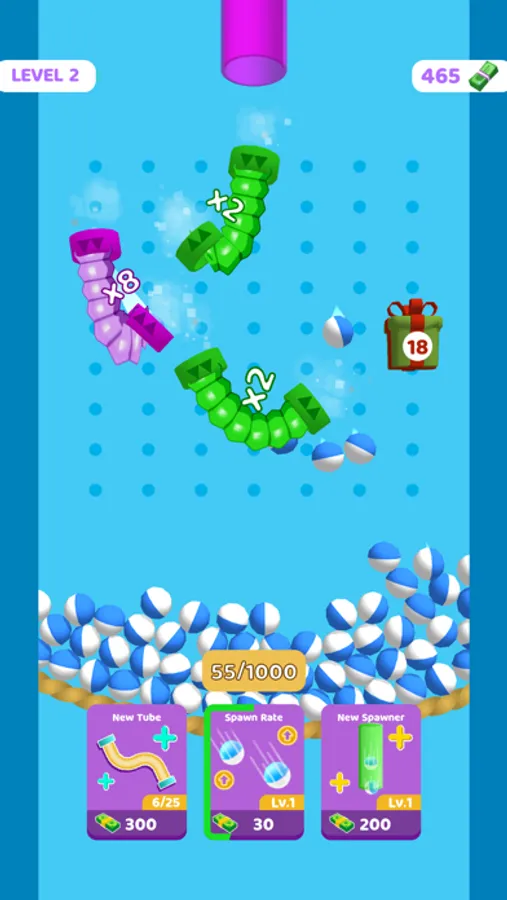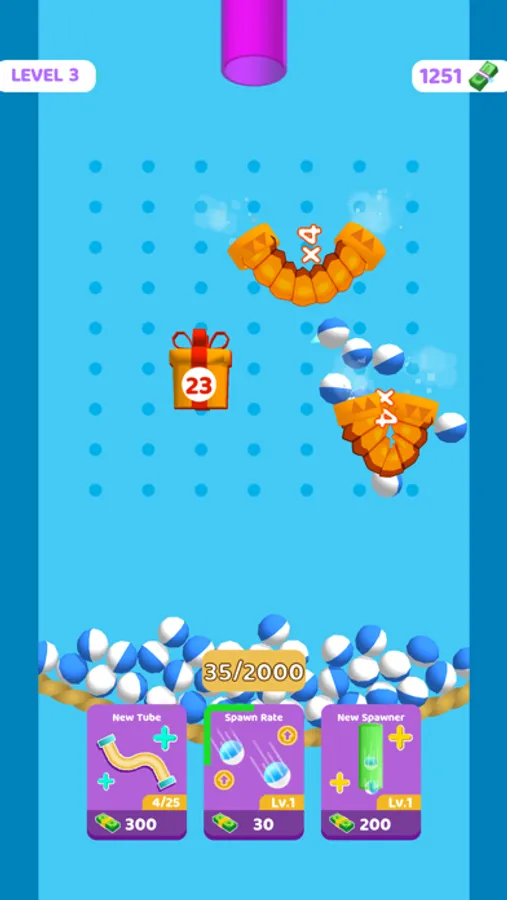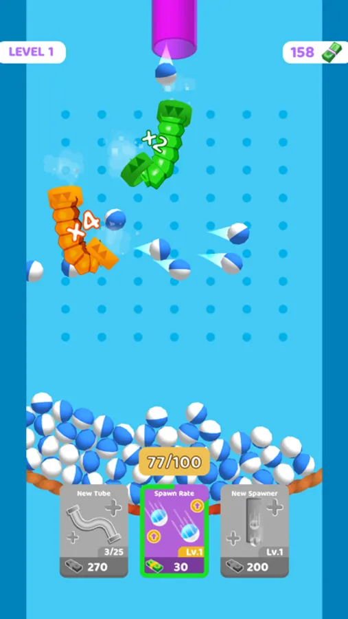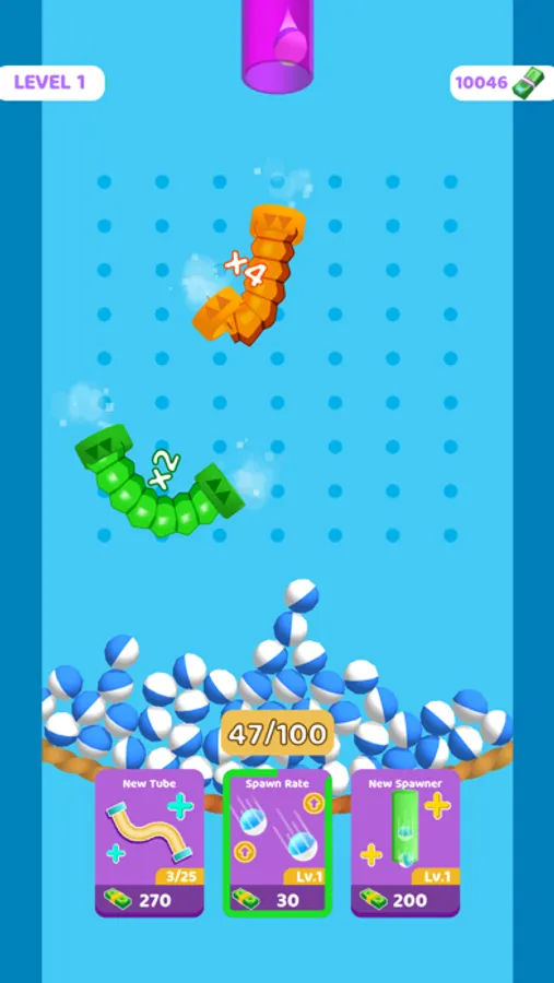 Create new balls and push them through the pipes. Each pipe has its own value and merge pipes to increase this value. Pipes with higher value will earn you more money. The more money you have, the more pipes you can buy and create new roads.