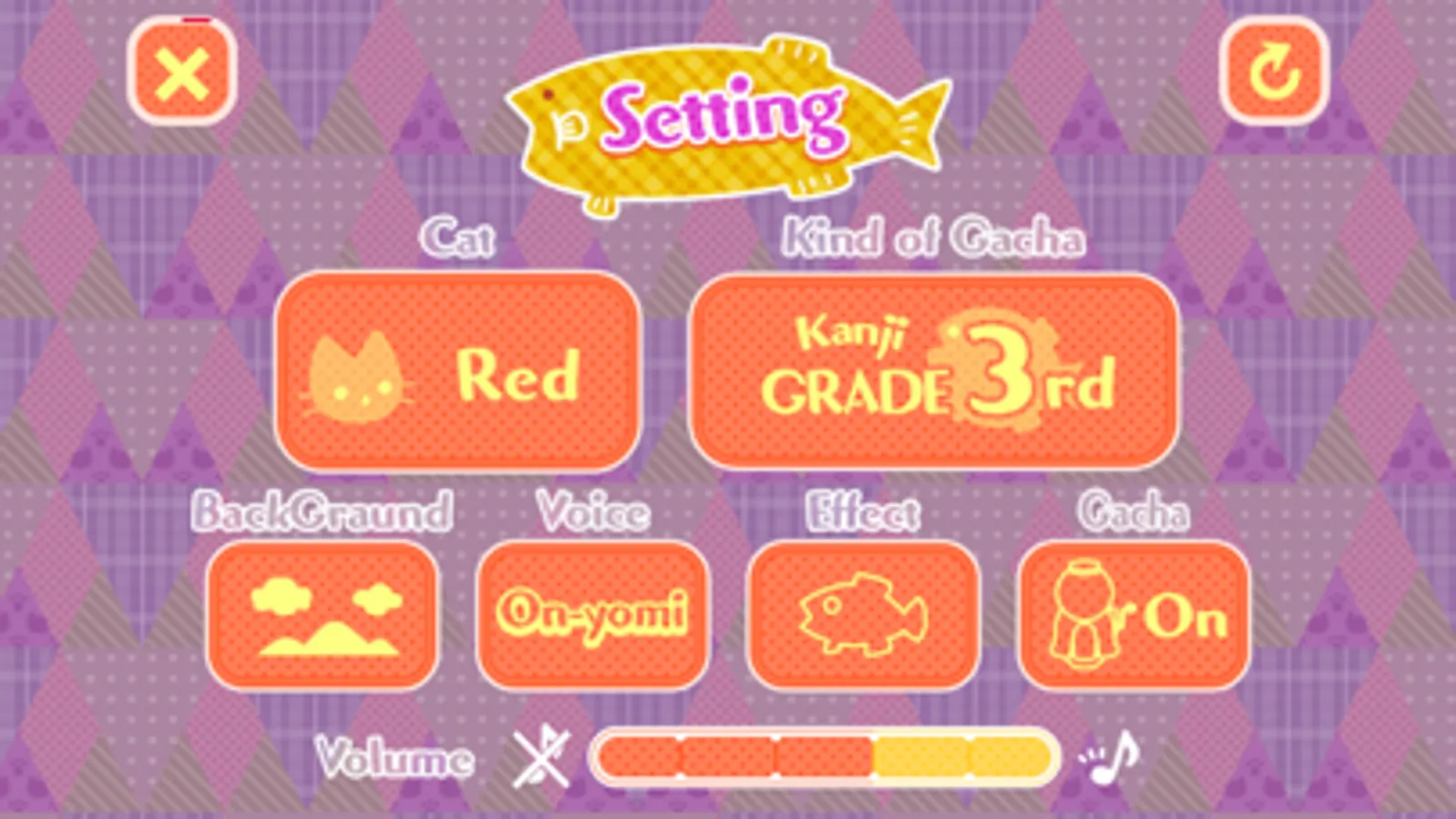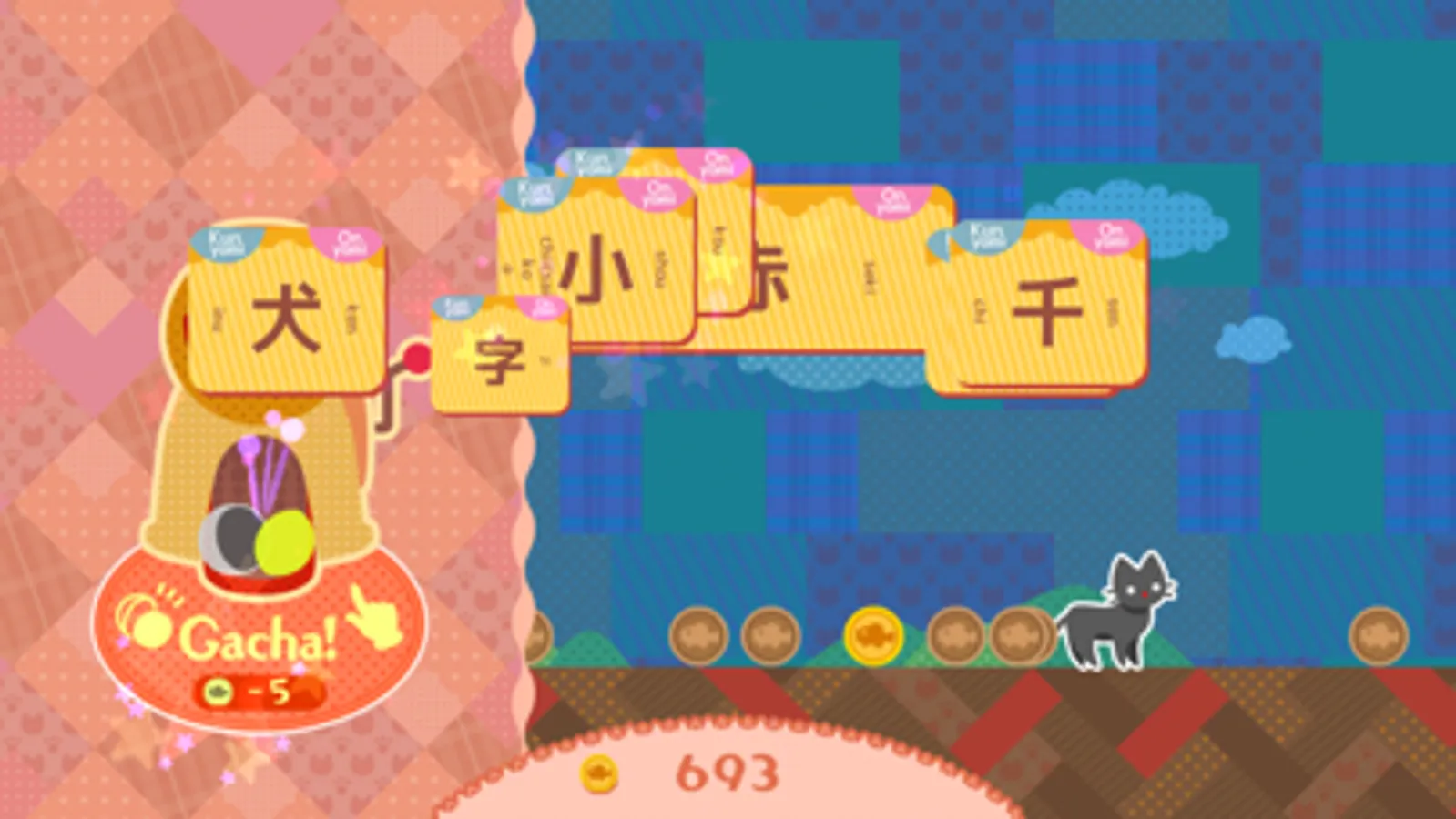 You can change the color of the cat, the grade of the Kanji Gacha, the touch effect, and the pronunciation and kun-yomi of the Kanji characters that appear.