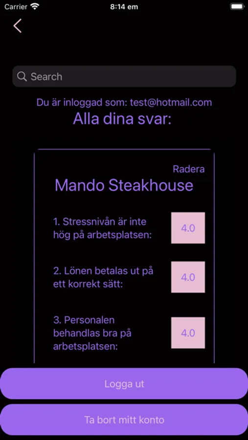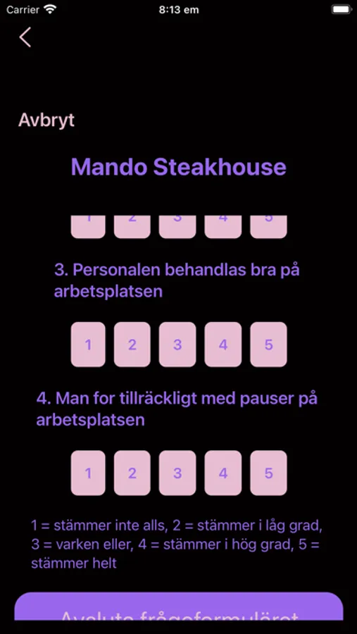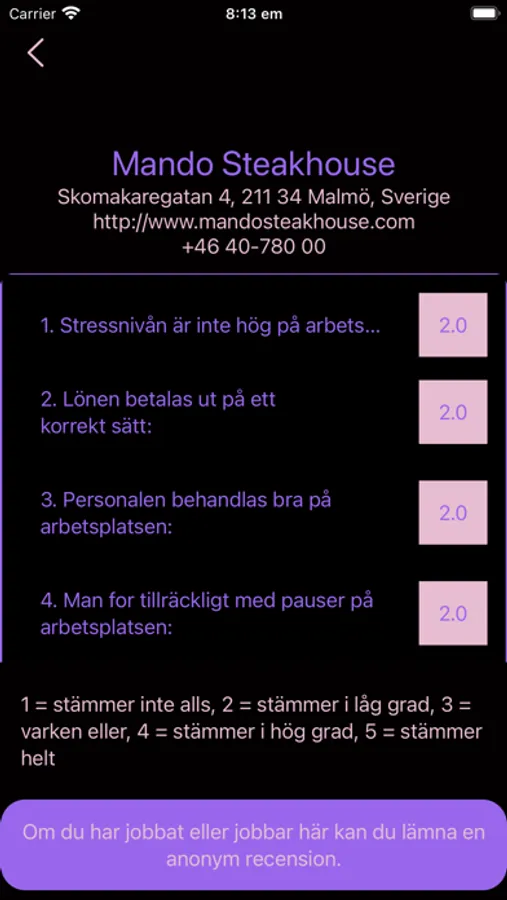 På denna appen får du betygsätta anonymt din arbetsplats utifrån stressnivån och hur arbetarna bemöts.Varje användare kan endast registrera ett svar för en arbetsplats och det är de senaste svaren som visas.