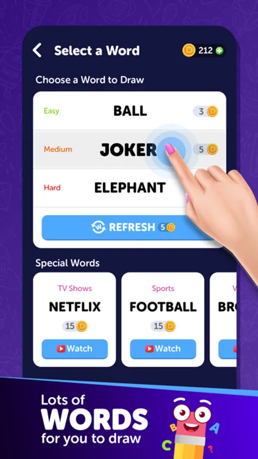 Earn coins and power ups and use them to draw words from our special packs! These handmade packs will dare you to move out of your comfort zone and draw exceptional pieces.