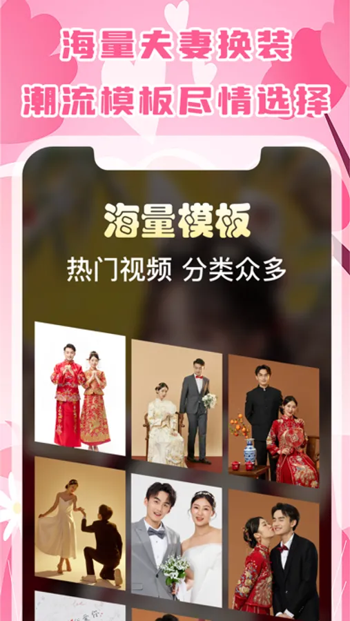 绝美婚纱模板、穿越时空变装、56个民族异域风情、古装汉服、优雅旗袍、帅气型男、公主精灵、春日浪漫花海……不管你喜欢哪个,都能一键制作变脸换装视频。