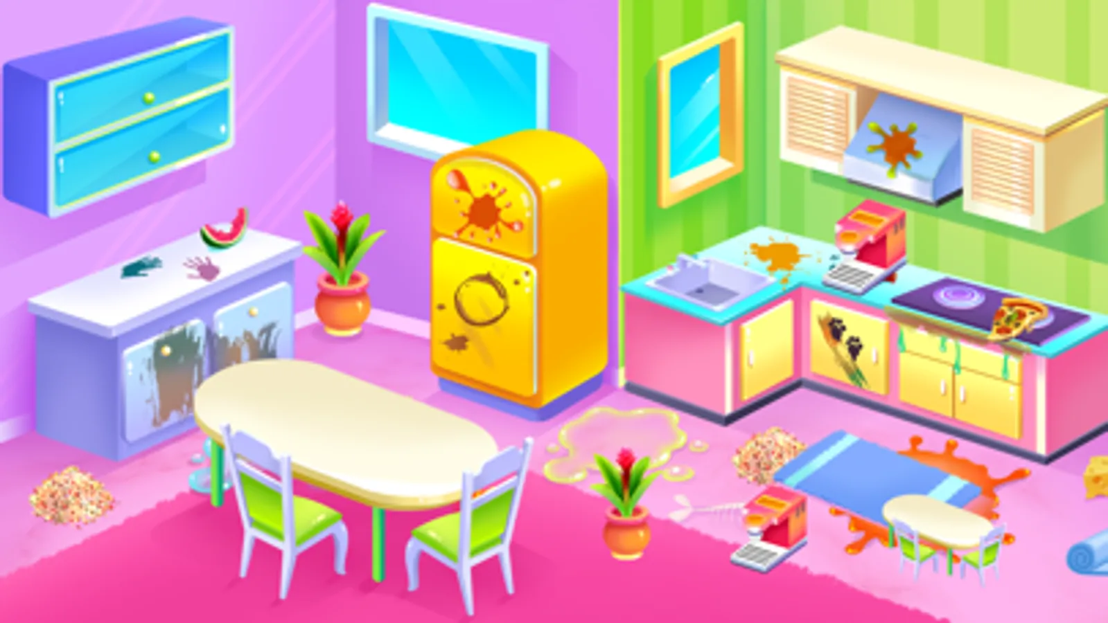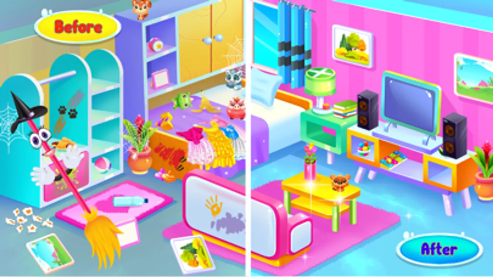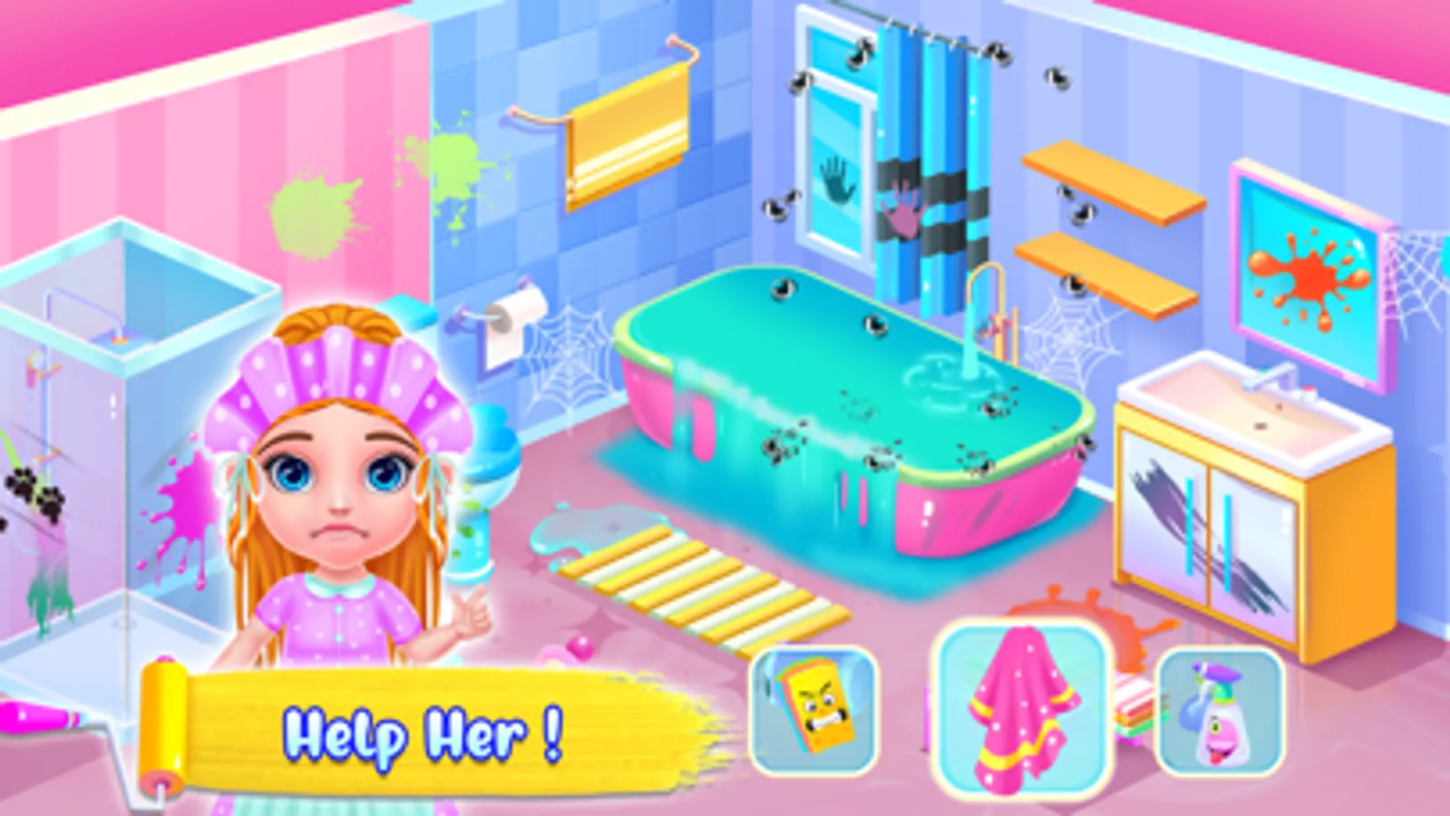 What a wonderful experience lies ahead of you! Help a cute doll princess get her home cleaned and redecorated. Press the start button and let us begin. Let’s go to the bedroom. This room sure needs a complete makeover: the walls are cracked, spider webs are hanging from every corner of the ceiling, clothes lie disorganized on the bed and there is trash everywhere. This is level 1. Each room represents a distinctive level. Now that you are in the bedroom you should start by collecting the trash, dusting off all the dirt and debris that has been lying on the furniture. Select the spray bottle solution and put it on the television’s screen, the sofa and the closet then scrub off all the stains. Next, pick the vacuuming tool and leave no corner unturned. Some nasty worms are eating away at your plant: you can remove them by tapping on their torso. Put the dresses in the wardrobe. After cleaning you will receive amazing gifts like a computer, a new plant, stereos, some tulips and many more. Arrange them as you wish in the princesses’ room. Clean the kitchen and dressing room in the same manner. Use the available tools to transform this house and make it look unrecognizable. The bathroom needs a deep clean as fast as possible. Collect the spider webs and wipe off the green spots from the tiles. Apply the cleaning solution to the bathtub and toilet and let it sit for a moment. Select the sponge and scrub thoroughly. The bacterias are all gone now. After the doll’s home is neat and uncluttered start renovating. Choose the designs of your liking: pick new furniture and add cute decorations to make the place cozier. It is time to return to the dressing room. Try out different hairstyles until you find the perfect one for the girl. There are a lot of great colorful clothes and for the best look , you should mix and match them. Take your time and most importantly have fun!