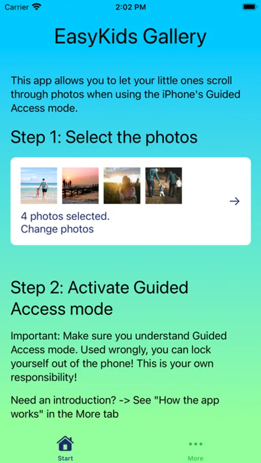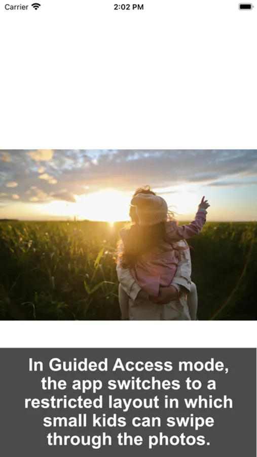 This EasyKids Gallery app is a solution for that. It does only one thing: You can create a photo gallery from the existing photos on your device. When you activate Guided Access mode for this app, the layout automatically switches to a more restricted view which only shows one of your selected photos at a time and allows to swipe left and right to get to the previous or next photo. Nothing else.