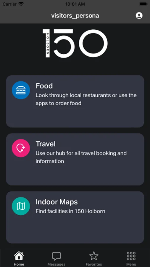 The 150 Holborn mobile application empowers employees with high-value digital workplace services in a branded and personalized app experience. Examples of features include: company-branded pages and company-specific content, daily and weekly schedule information for employees, reservations and room booking, directory, food and catering information, transit and parking options, workplace communications and alerts, and services ticketing. Additionally, the app includes a Visitor persona that helps enhance the experience of visitors coming to the 150 Holborn site.