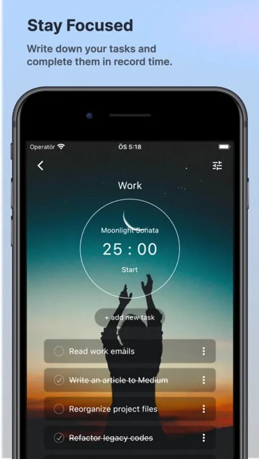 Less is more! We designed a modern, stylish, clean, minimalistic Pomodoro app with a to-do list with this motto in mind.